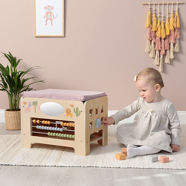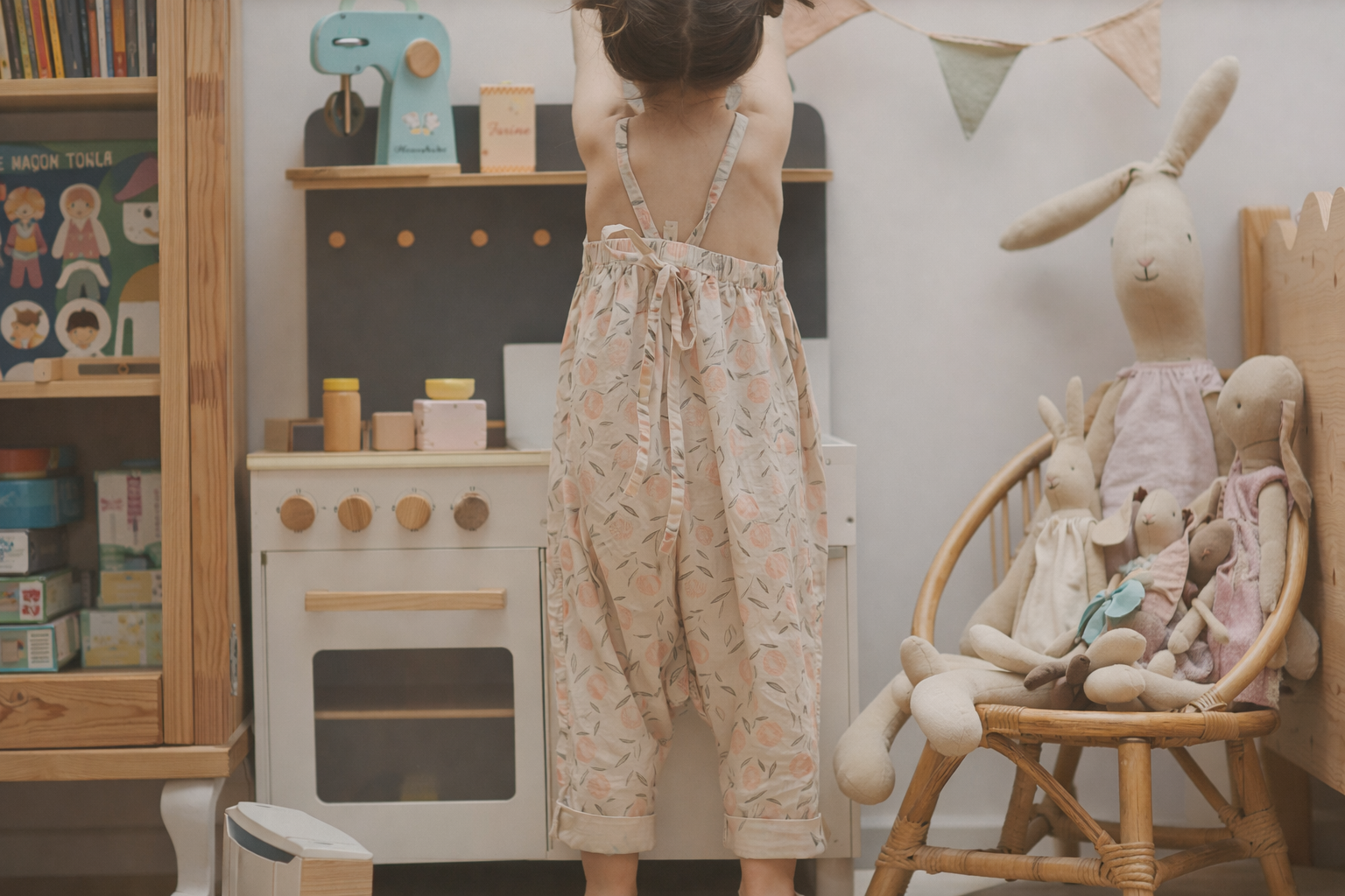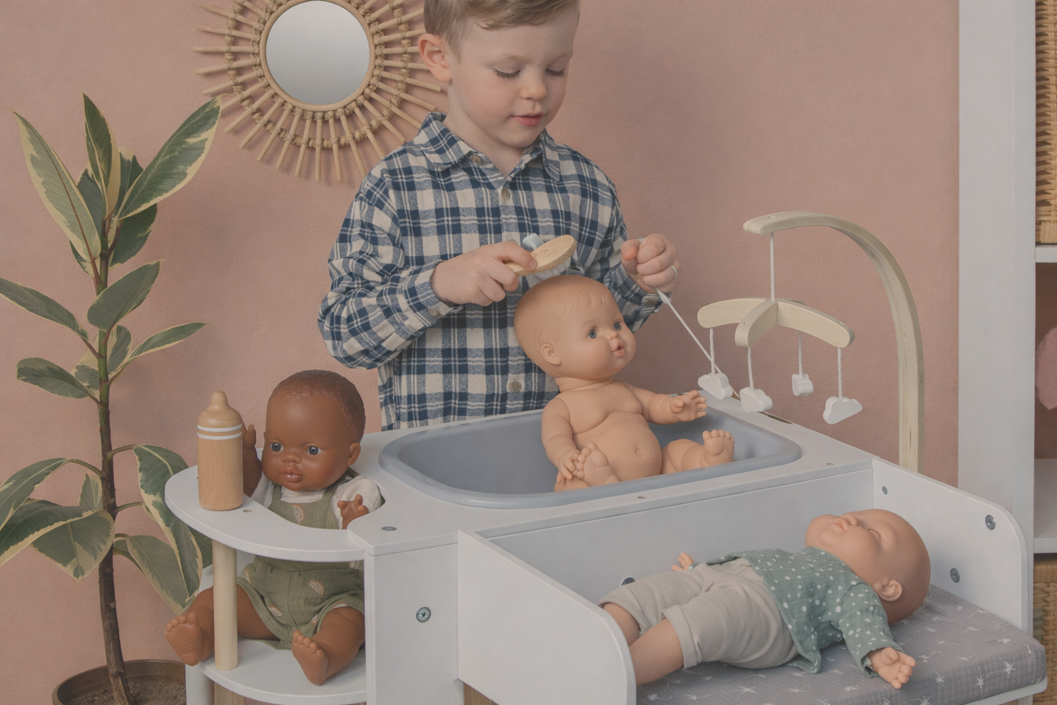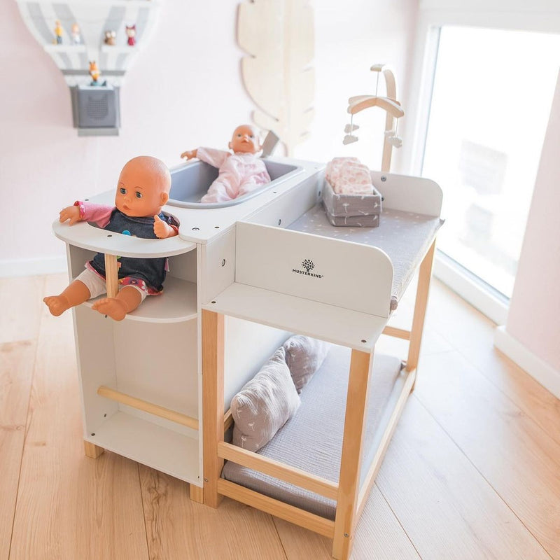 Already thrilled with the MUSTERKIND® play shop, we gave our little doll mommy the Viola Doll Center for her birthday. Since then, we now have three doll mommies who change, bathe, and feed their dolls at the Doll Center. Instead of lots of individual doll furniture, everything is neatly organized in one piece, and the practical thing is that you can play with the Doll Center from all sides. And the icing on the cake are the sweet details like the clothes hangers and the mobile above the changing table.